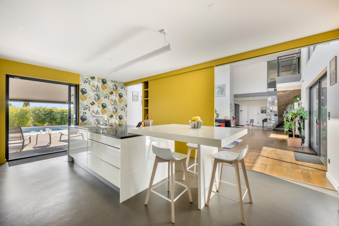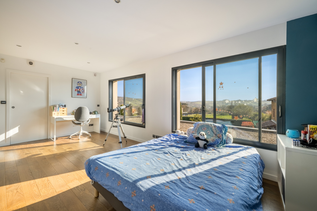 Beaujolais pierres dorées, proche centre village, sobre et harmonieuse maison contemporaine (470 m² de surface plancher, 300 m² hab) où l'intérieur est une prolongation de la nature qui entre en beauté par chaque baie vitrée et fenêtre. Elevée sur deux niveaux, elle comprend au rez de chaussée une vaste pièce de vie baignée de lumière et prolongée par une terrasse sud, une cuisine équipée, cellier. Une suite parentale, son dressing et sa salle de bain. Un bureau, vestiaire, buanderie. Accès direct aux garages, cave, caveau, pièces techniques et salle de sport. A l'étage : Un salon en mezzanine qui dessert 3 chambres et 2 salles d'eau. Cette belle maison est chauffée par deux pompes à chaleur (+rafraichissement au sol). Panneaux solaires, domotique. Borne électrique pour voitures. Abris extérieur pour véhicules. Maison faible en frais de fonctionnement. L'intérieur complétement refait (matériaux nobles et naturels) forme un véritable écrin contemporain d'une élégance certaine. Jardin paysagé (2235 m²) parfaitement clos, vue imprenable sud et ouest. Piscine sécurisée, terrasse en pierre tout autour de la piscine. Tél : 06 72 55 94 80 / 06 76 83 92 04