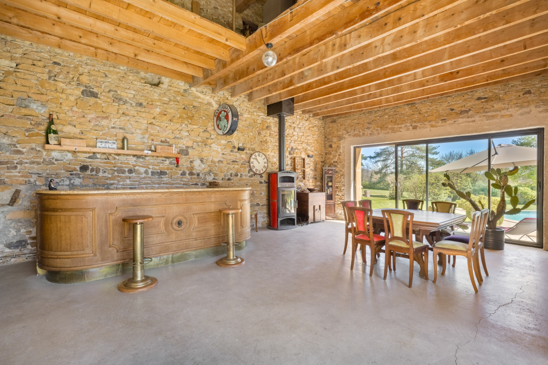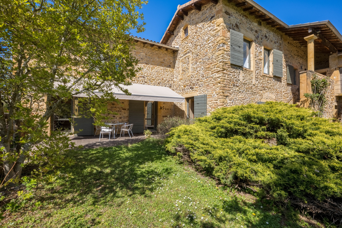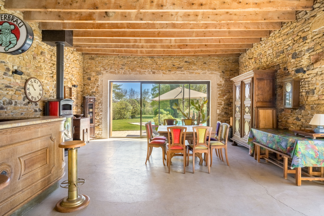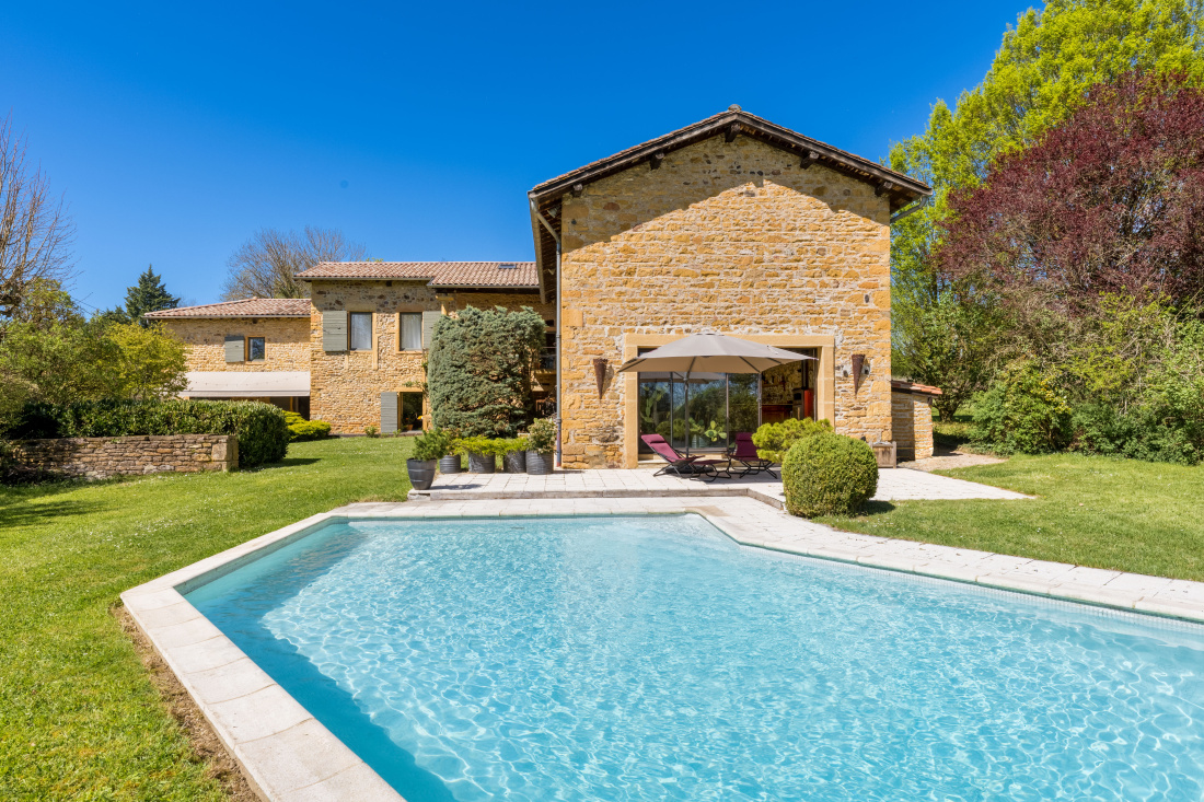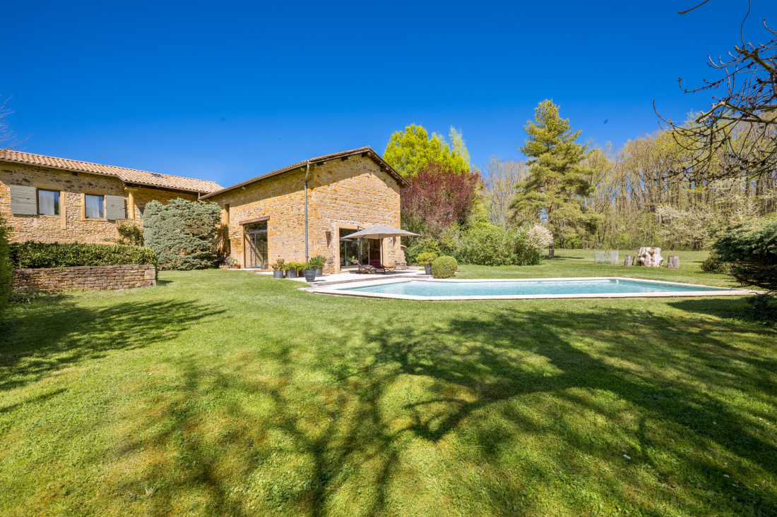 Beaujolais Pierres dorées, véritable écrin pour cette belle propriété en pierre restaurée, 260 m² hab : les pièces de vie ouvrent directement sur terrasse et jardin: hall d'entrée desservant une vaste cuisine équipée, un salon avec cheminée, salle à manger voutée. La circulation des pièces est fluide et harmonieuse. Une buanderie, cave à vins, accès direct au garage. A l'étage 4 vastes chambres dont une suite parentale avec salle de bain,douche et dressing. Un espace bureau et 3 autres chambres, 2 salles de bain, douche. Le tout complété par une magnifique grange chauffée (poêle à bois) ouverte sur parc, élevée sur 2 étages (environ 80 m² au sol). cette jolie dépendance présente de belles perspectives d'agrandissement. Atelier. Terrain plat d' 1 HA 7 composé de prés et bois.Très bel espace piscine. Exposition idéale sud-ouest. Carport et parkings extérieurs. Gros oeuvre en parfait état.( toiture et isolation récente). Intérieur sobre et de qualité. Emplacement exceptionnel : Aucune nuisance ni visuelle ni sonore. Lieu idéal pour se ressourcer en pleine nature sans être loin de tout : proche accès A6 et A 89, gare SNCF, centre village... Cette belle propriété convient parfaitement pour une vie de famille, ainsi que pour la création de chambres d'hôtes ou gîtes. Tél: 06 72 55 94 80 / 06 76 83 92 04